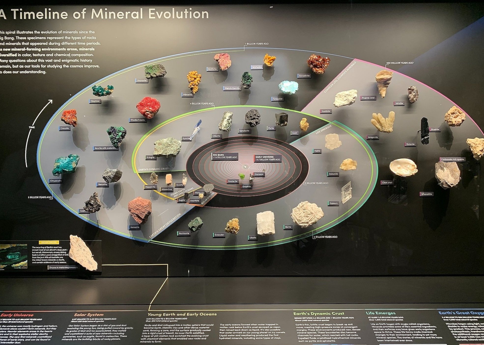 Mineral Evolution Exhibit 3D graphic timeline with integrated specimens exploring 14 billion years of mineral evolution.