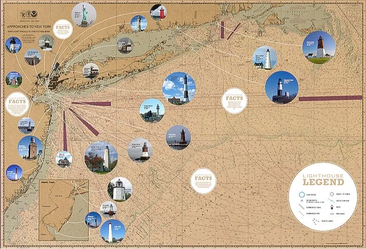 NY Lights A large map of New York Harbor highlights 25 lighthouses in the New York metropolitan area, taking in parts of Long Island, Northern New Jersey, Connecticut and the lower Hudson River.