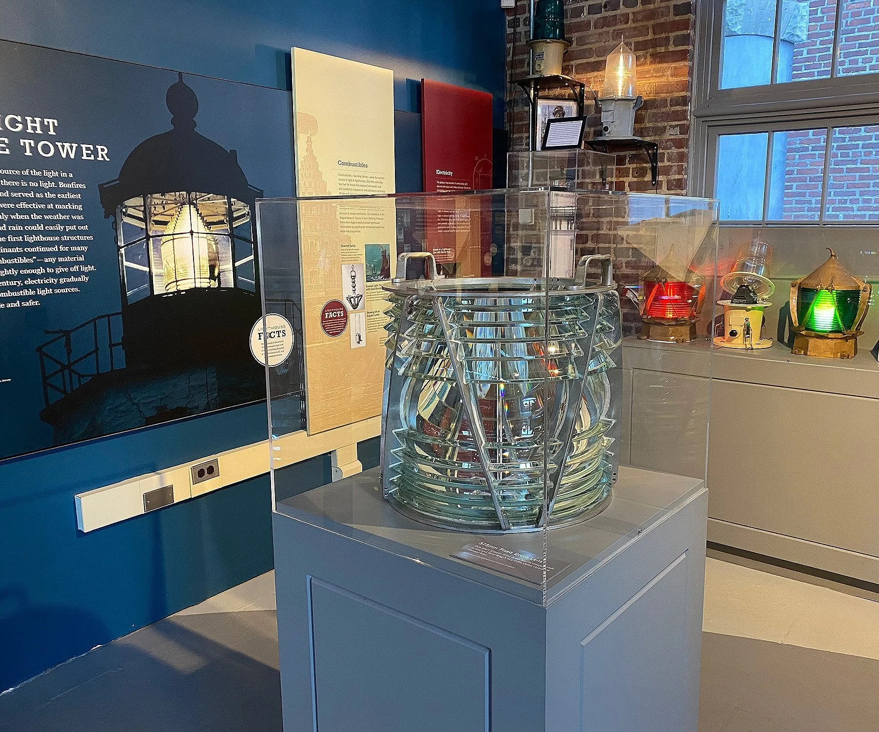 Illuminants and Optics This exhibit explores the range of light sources used as navigational aids throughout history, from candles to electric light. The story introduces visitors to Augustin Fresnel, interprets his development of the Fresnel lens, and explains how it works. The display of two fifth-order Fresnel lenses gives visitors the opportunity to view these beautiful objects up close.