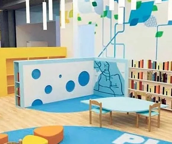 Library Overview and Information Desk The whimsical root, branch and leaf motifs of design's central "Tree of Knowledge" serve as color-coded wayfinding paths to the various areas of the library.
